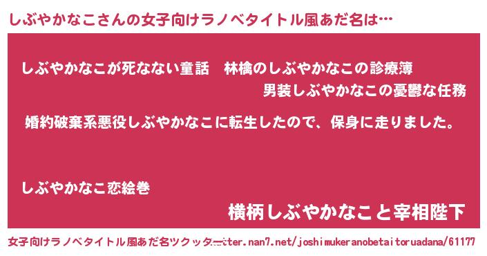 | 男性向けラノベタイトル風あだ名 | 『シブヤカナコスレイヤー』 |