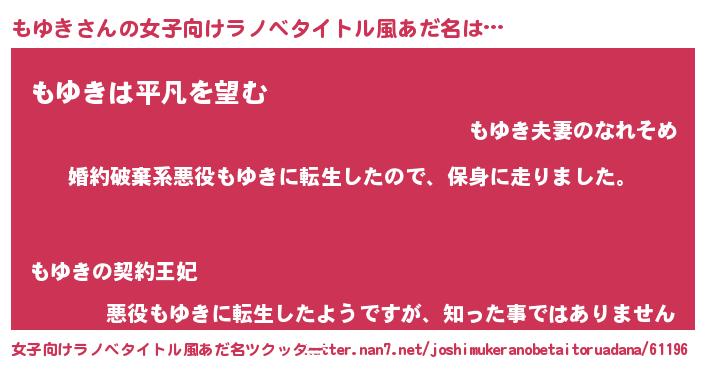 もゆきさんの女子向けラノベタイトル風あだ名は… 『婚約破棄系悪役もゆきに転生したので、保身に走りました。』『もゆきは平凡を望む』『悪役もゆきに転生したようですが、知った事ではありません』 ツクッター #女子向けラノベタイトル風あだ名ツクッター http://tkutter.nan7.net/joshimukeranobetaitoruadana/61196/