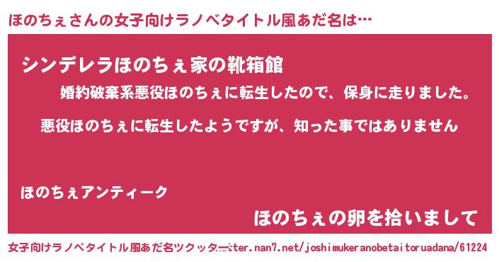 | 男性向けラノベタイトル風あだ名 | 『この素晴らしい世界にほのちぇを!』 |