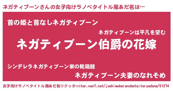 ネガティブーンさんの女子向けラノベタイトル風あだ名は… 『ネガティブーン伯爵の花嫁』『首の姫と首なしネガティブーン』『ネガティブーン夫妻のなれそめ』 ツクッター #女子向けラノベタイトル風あだ名ツクッター http://tkutter.nan7.net/joshimukeranobetaitoruadana/61274/
