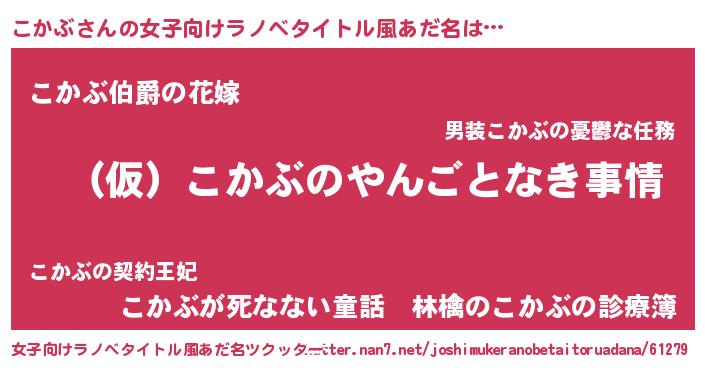 | 男性向けラノベタイトル風あだ名 | 『こかぶの憂鬱』『魔弾の王とこかぶ』 |