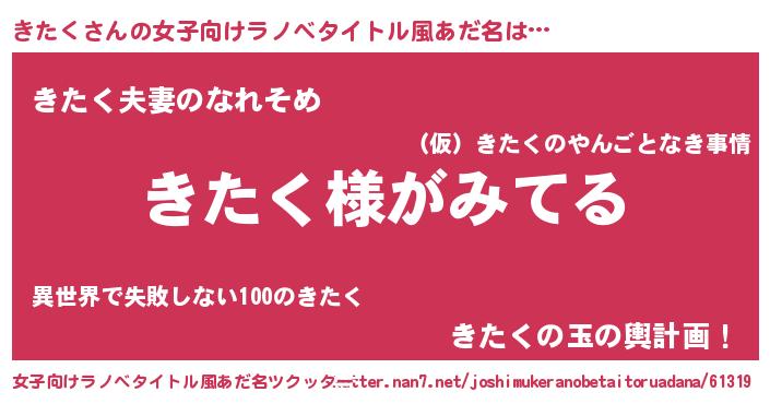 | 男性向けラノベタイトル風あだ名 | 『きたくの嫁は女の子じゃないと思った?』 |