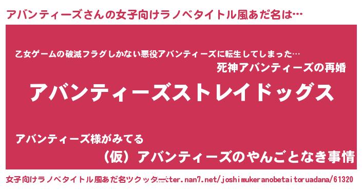 | 男性向けラノベタイトル風あだ名 | 『Re:アバンティーズから始める異世界生活』 |