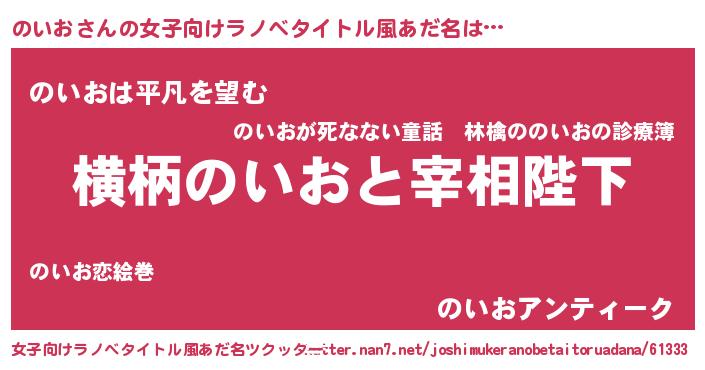 | 男性向けラノベタイトル風あだ名 | 『のいおに滅ぼされるだけの簡単なお仕事です』 |