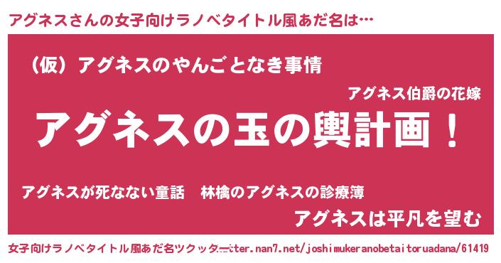 | 男性向けラノベタイトル風あだ名 | 『アグネス~年齢イコール彼女いない歴の魔法使い~』 |