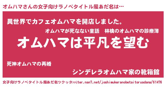 | 胡散臭い通販商品みたいなあだ名 | 『信頼と実績のサプリメント…その名も「オムハマ」』 |
