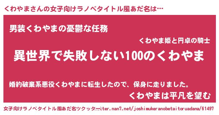 | 男性向けラノベタイトル風あだ名 | 『くわやまという概念が存在しない退屈な世界 』 |