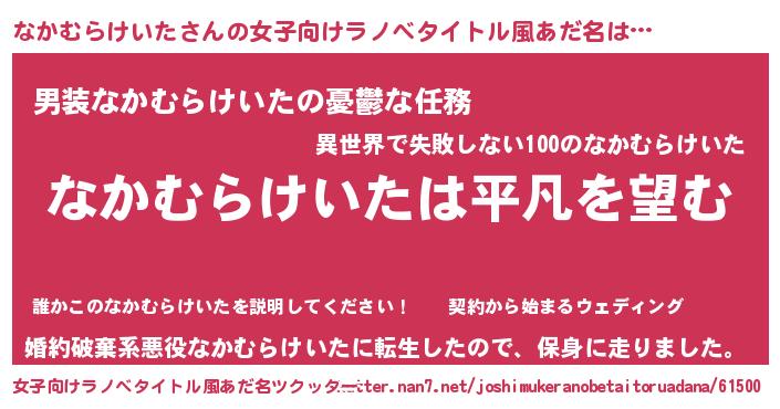 | 男性向けラノベタイトル風あだ名 | 『ダンジョンになかむらけいたを求めるのは間違っているだろうか』 |