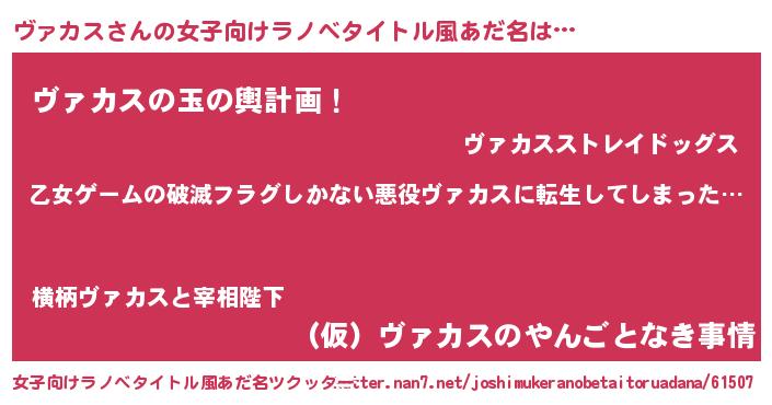 | 男性向けラノベタイトル風あだ名 | 『魔弾の王とヴァカス』『ヴァカスの憂鬱』 |