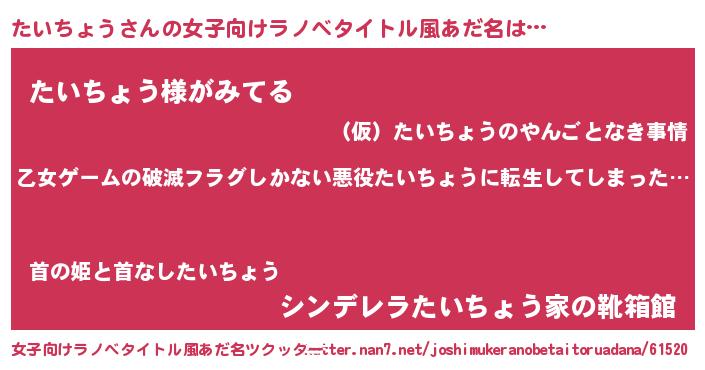 | 男性向けラノベタイトル風あだ名 | 『この素晴らしい世界にたいちょうを!』 |