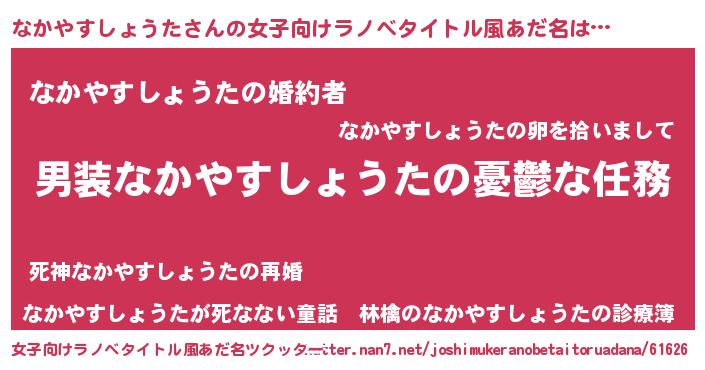 | 男性向けラノベタイトル風あだ名 | 『うちのなかやすしょうたが世界を掌握している!』 |