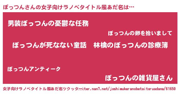 ぼっつんさんの女子向けラノベタイトル風あだ名は… 『ぼっつんが死なない童話 林檎のぼっつんの診療簿』『男装ぼっつんの憂鬱な任務』『ぼっつんの雑貨屋さん』 ツクッター #女子向けラノベタイトル風あだ名ツクッター http://tkutter.nan7.net/joshimukeranobetaitoruadana/61650/