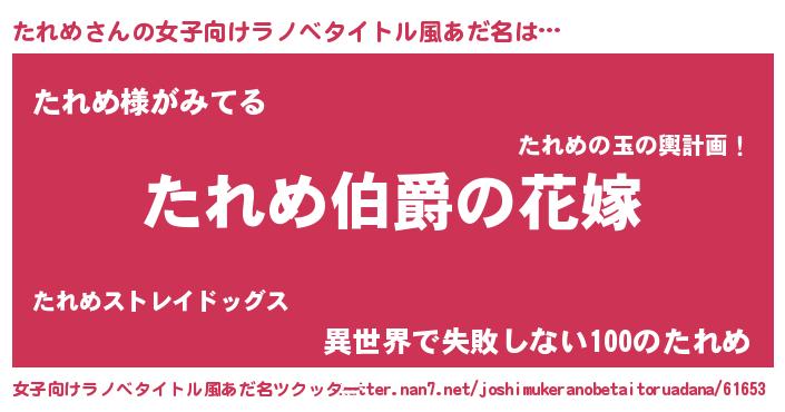 たれめさんの女子向けラノベタイトル風あだ名は… 『たれめ伯爵の花嫁』『たれめ様がみてる』『異世界で失敗しない100のたれめ』 ツクッター #女子向けラノベタイトル風あだ名ツクッター http://tkutter.nan7.net/joshimukeranobetaitoruadana/61653/