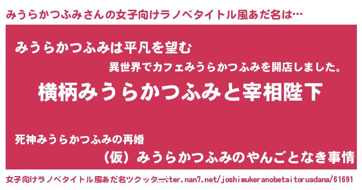 | 男性向けラノベタイトル風あだ名 | 『みうらかつふみに滅ぼされるだけの簡単なお仕事です』 |