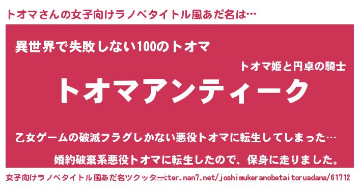 | 意味不明あだ名 | 『自称トオマ』『永久保存トオマ』 |