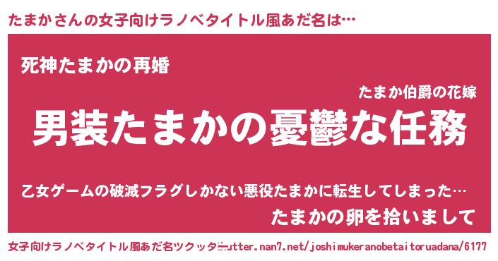 | 男性向けラノベタイトル風あだ名 | 『うちのたまかが世界を掌握している!』 |
