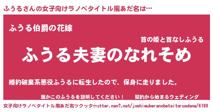| 男性向けラノベタイトル風あだ名 | 『おまえをオタクにしてやるから、俺をふうるにしてくれ! 』 |