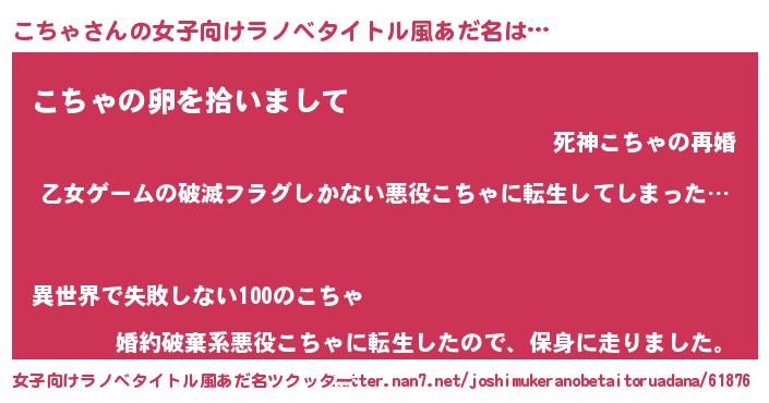 | 男性向けラノベタイトル風あだ名 | 『この素晴らしい世界にこちゃを!』 |