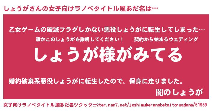 | 男性向けラノベタイトル風あだ名 | 『しょうがの嫁は女の子じゃないと思った?』 |