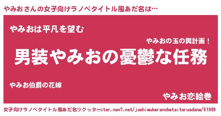 | 男性向けラノベタイトル風あだ名 | 『冴えないやみおの育てかた』 |