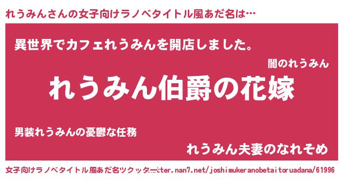| 男性向けラノベタイトル風あだ名 | 『うちの娘の為ならば、俺はもしかしたられうみんも倒せるかもしれない。』 |