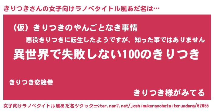 | 男性向けラノベタイトル風あだ名 | 『きりつきという概念が存在しない退屈な世界 』 |