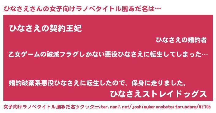 | 男性向けラノベタイトル風あだ名 | 『この素晴らしい世界にひなさえを!』 |