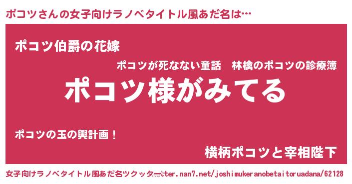ポコツさんの女子向けラノベタイトル風あだ名は… 『ポコツ様がみてる』『ポコツ伯爵の花嫁』『横柄ポコツと宰相陛下』 ツクッター #女子向けラノベタイトル風あだ名ツクッター http://tkutter.nan7.net/joshimukeranobetaitoruadana/62128/