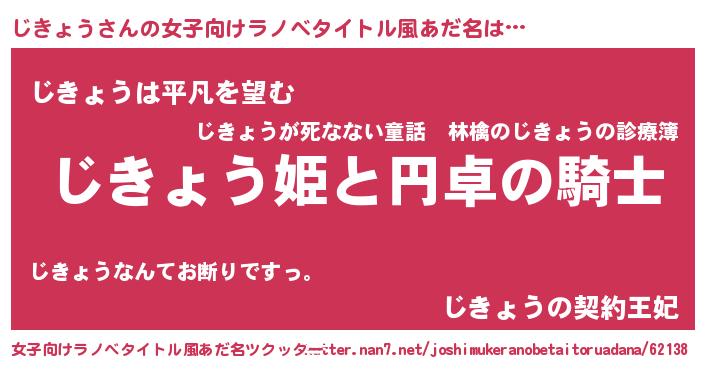 じきょうさんの女子向けラノベタイトル風あだ名は… 『じきょう姫と円卓の騎士』『じきょうは平凡を望む』『じきょうの契約王妃』 ツクッター #女子向けラノベタイトル風あだ名ツクッター http://tkutter.nan7.net/joshimukeranobetaitoruadana/62138/