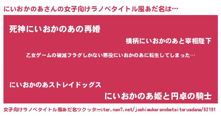 | 男性向けラノベタイトル風あだ名 | 『魔弾の王とにいおかのあ』 |
