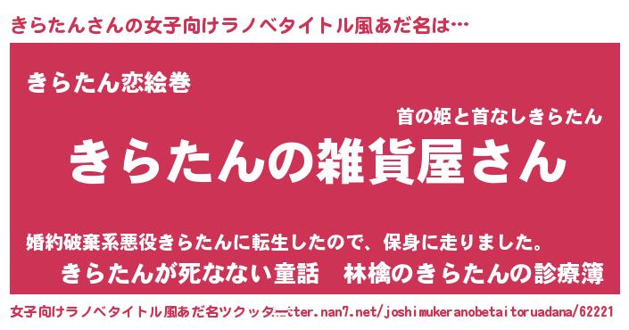 | 男性向けラノベタイトル風あだ名 | 『やはりきらたんの青春ラブコメはまちがっている 』 |