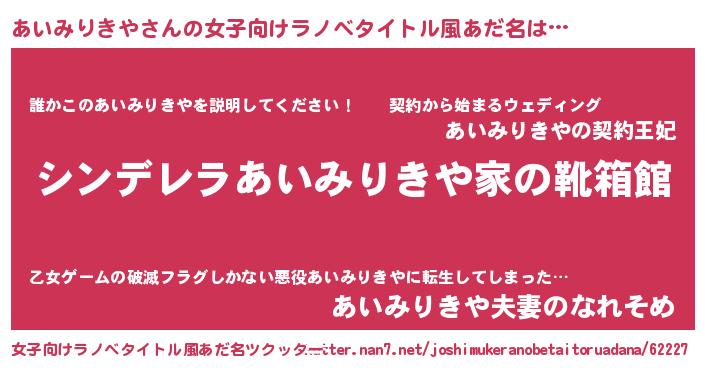 | 男性向けラノベタイトル風あだ名 | 『冴えないあいみりきやの育てかた』 |