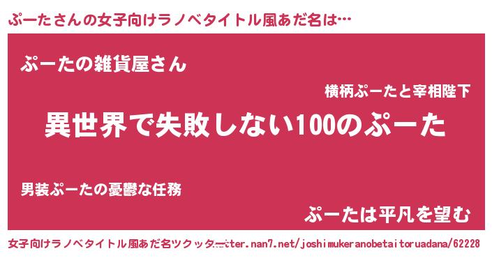 ぷーたさんの女子向けラノベタイトル風あだ名は… 『異世界で失敗しない100のぷーた』『ぷーたの雑貨屋さん』『ぷーたは平凡を望む』 ツクッター #女子向けラノベタイトル風あだ名ツクッター http://tkutter.nan7.net/joshimukeranobetaitoruadana/62228/
