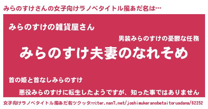 | 男性向けラノベタイトル風あだ名 | 『おまえをオタクにしてやるから、俺をみらのすけにしてくれ! 』 |