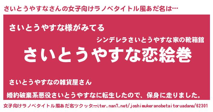 | 男性向けラノベタイトル風あだ名 | 『おまえをオタクにしてやるから、俺をさいとうやすなにしてくれ! 』 |