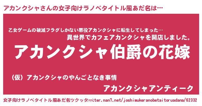 | 男性向けラノベタイトル風あだ名 | 『うちの娘の為ならば、俺はもしかしたらアカンクシャも倒せるかもしれない。』 |