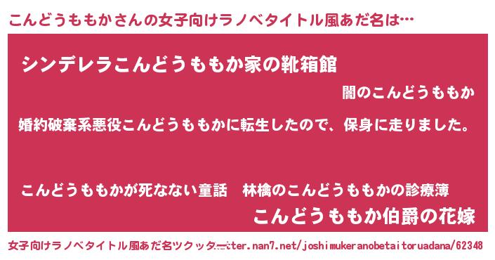 こんどうももかさんの女子向けラノベタイトル風あだ名は… 『婚約破棄系悪役こんどうももかに転生したので、保身に走りました。』『シンデレラこんどうももか家の靴箱館』『こんどうももか伯爵の花嫁』 ツクッター #女子向けラノベタイトル風あだ名ツクッター http://tkutter.nan7.net/joshimukeranobetaitoruadana/62348/