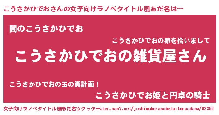 こうさかひでおさんの女子向けラノベタイトル風あだ名は… 『こうさかひでおの雑貨屋さん』『闇のこうさかひでお』『こうさかひでお姫と円卓の騎士』 ツクッター #女子向けラノベタイトル風あだ名ツクッター http://tkutter.nan7.net/joshimukeranobetaitoruadana/62356/