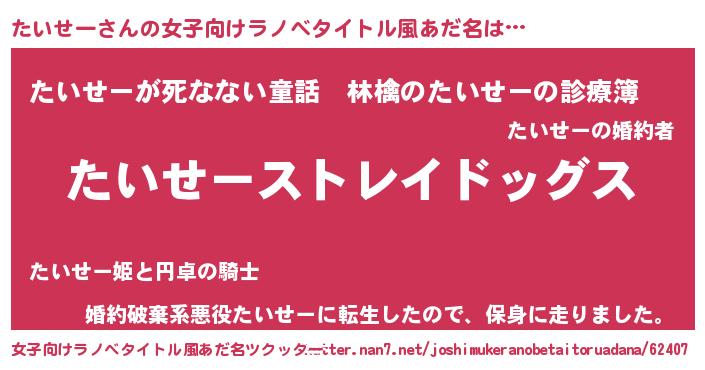 | 男性向けラノベタイトル風あだ名 | 『Re:たいせーから始める異世界生活』 |