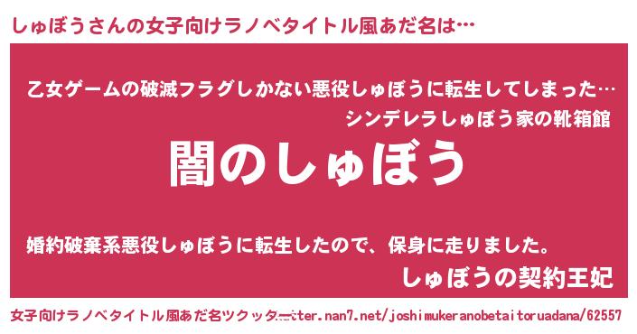 | 男性向けラノベタイトル風あだ名 | 『Re:しゅぼうから始める異世界生活』 |