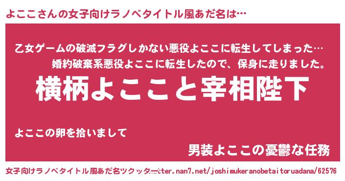 | 男性向けラノベタイトル風あだ名 | 『よここに滅ぼされるだけの簡単なお仕事です』 |