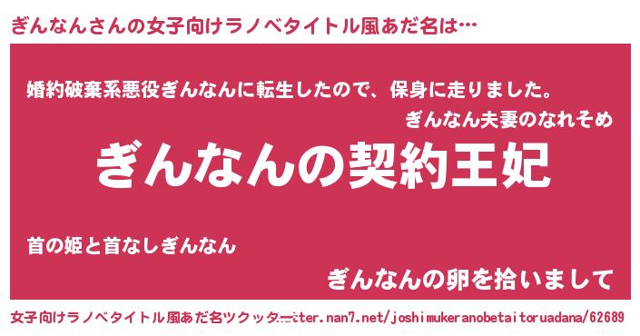 | 男性向けラノベタイトル風あだ名 | 『ぎんなんという概念が存在しない退屈な世界 』 |