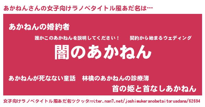 | 男性向けラノベタイトル風あだ名 | 『Re:あかねんから始める異世界生活』 |