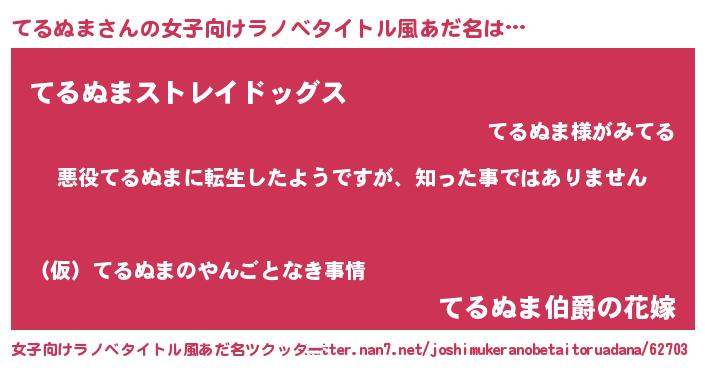 | 男性向けラノベタイトル風あだ名 | 『この素晴らしい世界にてるぬまを!』 |