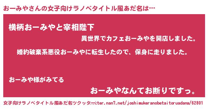 おーみやさんの女子向けラノベタイトル風あだ名は… 『婚約破棄系悪役おーみやに転生したので、保身に走りました。』『横柄おーみやと宰相陛下』『おーみやなんてお断りですっ。』 ツクッター #女子向けラノベタイトル風あだ名ツクッター http://tkutter.nan7.net/joshimukeranobetaitoruadana/62801/