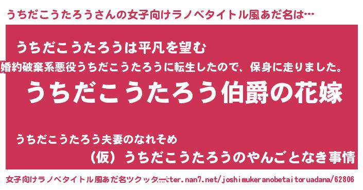 うちだこうたろうさんの女子向けラノベタイトル風あだ名は… 『うちだこうたろう伯爵の花嫁』『うちだこうたろうは平凡を望む』『(仮)うちだこうたろうのやんごとなき事情』 ツクッター #女子向けラノベタイトル風あだ名ツクッター http://tkutter.nan7.net/joshimukeranobetaitoruadana/62806/