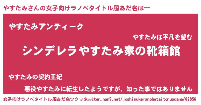 | 意味不明あだ名 | 『自称やすたみ』『永久保存やすたみ』 |