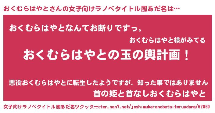 | 男性向けラノベタイトル風あだ名 | 『おくむらはやと~年齢イコール彼女いない歴の魔法使い~』 |