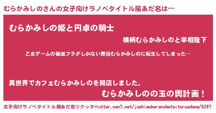 | 男性向けラノベタイトル風あだ名 | 『この素晴らしい世界にむらかみしのを!』 |