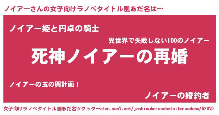 ノイアーさんの女子向けラノベタイトル風あだ名は… 『死神ノイアーの再婚』『ノイアー姫と円卓の騎士』『ノイアーの婚約者』 ツクッター #女子向けラノベタイトル風あだ名ツクッター http://tkutter.nan7.net/joshimukeranobetaitoruadana/62870/